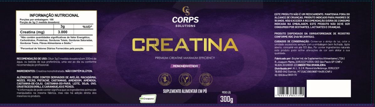 Eleve o nível dos seus treinos com a Creatina CorpsSolution. Desenvolvida para quem busca o máximo desempenho, nossa fórmula entrega 300g de pureza absoluta.